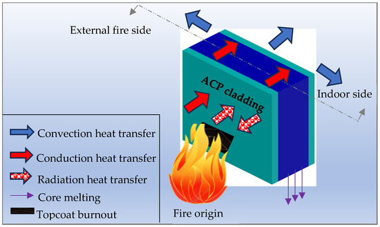 Heat transfer through cladding panels controls the overall thermal performance of the building. A schematic view of the usual heat transfer modes is presented in Figure 8. The thermal conductivity of a material is directly connected to the heat conduction through the material [183]. It is one of the most important thermal properties widely studied in developing thermally insulated construction materials [6]. The thermal conductivity property is crucial for better cladding performance [4]. Table 9 presents some cladding brands’ thermal conductivity and weight per square meter (kg/m2) and thermal resistance (m2·K/W). It can be seen from Table 9 that the cladding panels containing flame-retardant fillers have a lower thermal conductivity than the solid aluminium panels and honeycomb panels. This is due to the high heat transfer ability of the aluminium metal lattice [28]. A high amount of heat energy transfers through the lattice when a high temperature difference exists on aluminium surfaces. In addition, due to the weak metallic bonding in aluminium, its heat transfer is very high as electrons can freely move throughout the material [28]. Flame-retardant fillers have a very low thermal conductivity compared to aluminium because the basic function of these materials is to interrupt heat transfer during combustion by producing barriers or absorbing heat during chemical reactions [184]. Due to aluminium’s high heat conductivity, aluminium composite panels typically have a very low thermal resistance, making them inadequate insulators in and of themselves. Nonetheless, the thermal resistance of products such as PROCORE-A1, ALPOLIC A2, and LARCORE A2 is somewhat increased by the addition of fire-rated or mineral-filled cores. The fibre–cement-based cladding panels exhibit higher thermal resistance, indicating them as better insulating materials.