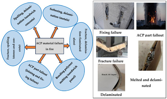 Several non-combustible composite panels have been developed, such as solid aluminium panels [9,22], honeycomb panels [23,24], fibre–cement-based boards [25,26,27], etc. The major drawback of the solid aluminium panel is its higher thermal conductivity (237 W/mK) [28]. This property is directly related to the heat transfer. The disadvantages of the existing fibre–cement-based non-combustible composite panels are heavy weight [29], higher price [30], difficulty in installation due to heavy weight [29] and manpower requirements, and higher water absorbency [31] compared to honeycomb panels or solid aluminium cladding panels. The bonding of the aluminium skin with the core material is crucial in honeycomb panels and ACP cladding panels. At elevated temperatures, the bonding becomes weaker, leading to the delamination of the metal skin from the core materials of the honeycomb panel and ACP panel. This phenomenon was observed during testing regardless of the use of combustible [10] or non-combustible panels [32]. Although there is no ignition of the non-combustible materials at higher temperatures, the aluminium skin falls due to the delamination process, which stimulates the fire risk and spreads the fire due to the melting of the aluminium skin and cracking of core materials [32]. A few techniques [33] have been applied to develop strong bonds between core materials and outer metal sheets by applying adhesive film or mechanical joints. Still, these techniques also have several disadvantages, such as the melting of adhesive film at higher temperatures and crack formation [33].