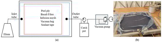 This work presents a novel and accurate VARTI process as follows: The BF layers, peel ply, infusion mesh, and vacuum bag were placed on a stainless-steel plate, which was covered with a Teflon layer (Figure 1). The curing of Elium resin was carried out following the manufacturer’s guidelines. The process parameters (temperature, pressure, and time) were carefully controlled to ensure a complete curing process. The three parts of the Elium resin were mixed for 5 min, and degassing was conducted for 10 min at a vacuum level of −900 mbar at room temperature (RT) (19 ± 2 °C). The vacuum system draws liquid resin from the pot into the bag, facilitating thorough impregnation and consolidation with the basalt fibre reinforcement. Due to Elium’s low density, a low vacuum infusion level of −700 mbar at room temperature (RT) was optimised and selected until the reactivity of Elium (gel time, approximately 3 h) was achieved. This allows for slow resin flow and prevents voids, bubbles, or cavities from forming inside or on the surface of the cured laminate (compared to about −900 mbar used for high-viscosity epoxy-based composites).