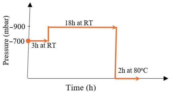 After impregnation, the BF layers and Elium reached gel behaviour (curing process). The inlet pipe was closed while the outlet pipe was left open for 18 h, controlling the vacuum to a high level of −900 mbar (Figure 2) during this process to prevent losing vacuum pressure; hence, Elium has low reactivity under vacuum conditions. The last step was post-curing for two hours at 80 °C.