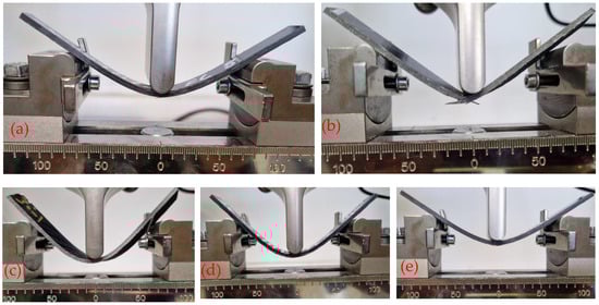 Samples under the flexural test with fibre angles of (a) 0°, (b) 15°, (c) 30°, (d) 45°, and (e) 90°.