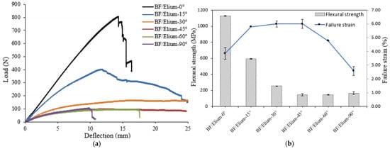(a) Load–deflection curves and (b) flexural strength and failure strain of various fibre orientation angles.