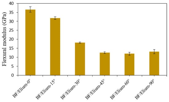 Figure 5 represents the flexural modulus at various fibre orientation angles of the basalt/Elium composites. The stiffness values almost followed the load and strength behaviour. Hence, it was reduced to 11.94 GPa at 60° and then increased to 13.14 GPa at 90°, with decrements of 67.4% and 64.1%, respectively. It was observed that the stiffness of the 15° off-axis composite was reduced by 13.2%.