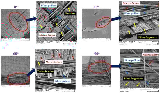 In order to evaluate the micromechanics of the fracture surfaces, the failed specimens were examined using Mira SEM (Tescan, Oxford Instruments, Cambridge, UK). Figure 7 presents the SEM fractography of the specimens’ upper surface (compression side) at various fibre orientation angles, which was taken to observe the failure mechanism at the microstructural level. It was observed that the failure of the 0° on-axis sample was initiated with fibre pull-out and matrix fragmentation at the upper surface when the load reached its maximum value. Additionally, as seen in the images of Figure 3 and Figure 6 and the SEM image of the 0° on-axis sample, the failure occurred at the upper surface (compression side), and there are no signs of failure on the lower surface (tension side). Lamina delamination occurred near the upper and lower fractured surfaces following the failure of the upper surface. While the failure mechanisms of the off-axis samples differed, it was observed that the samples twisted with increasing flexural loading during flexural testing at 15° and 30° (Figure 3). The fibres were pulled out, and matrix fracture occurred when the load reached the maximum at the upper and lower side for the 15° sample, while at angle 60°, the behaviour was similar due to the increasing shear; hence, small fibres were broken from the lower compression side of the sample, and there is no clear broken fibre or matrix for the 60° sample. According to the ASTM D790 standard [], the support span-to-depth ratio must be selected to ensure that failure occurs in the outer fibres of the specimen solely due to bending moments. Furthermore, certain materials that do not fail at strains up to 5% may exhibit a load–deflection response characterised by a yield point, where the load ceases to increase despite continued strain.
