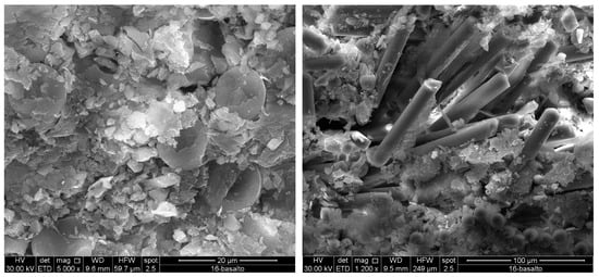 Scanning electron microscopy was used to investigate the morphology of neat basalt fiber-reinforced composites, PO powder, and PO–epoxy hybrid composites. Figure 1 shows the SEM micrograph of the epoxy–basalt composite. It is possible to observe the typical smooth and glassy morphology of the epoxy matrix, which appears homogeneous, with minimal porosity and good dispersion through the basalt fibers.