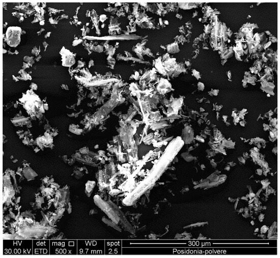 An SEM micrograph of the obtained PO powder is shown in Figure 2. It is characterized by an irregular morphology with different-shaped particles, some of which appear fibrous or elongated, while others are more granular or fragmented.