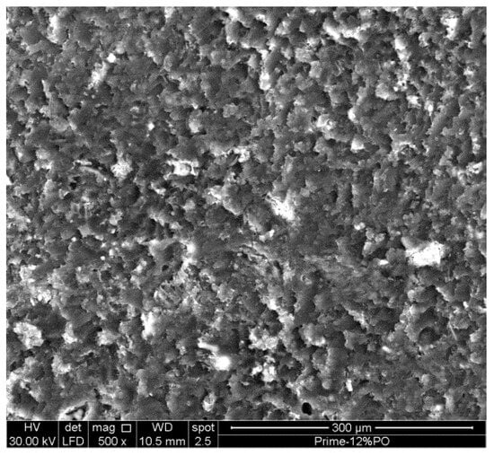 SEM analysis of the hybrid resins was accomplished also (Figure 3, Figures S1 and S2). In Figure 3, the micrograph of the composite exhibits a uniform dispersion of PO.
