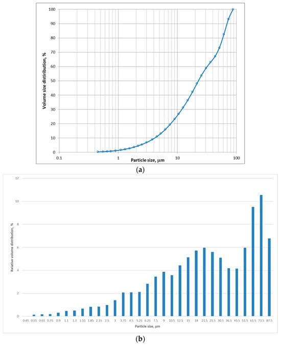The size of the PO granules was measured by laser diffraction, and the results are shown in Figure 4. Figure 4a illustrates the percentage of cumulative volume and Figure 4b shows the non-cumulative relative volume distribution as a function of the particle size.
