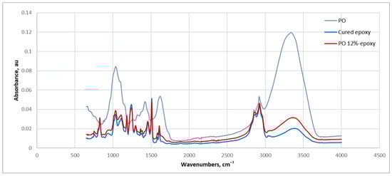 FT-IR analysis was performed to investigate potential chemical interactions between the epoxy resin and the PO powder. The FT-IR spectra relative to the PO, the neat epoxy, and the hybrid resin with PO at 12% w/w are shown in Figure 5 and Figure S3.