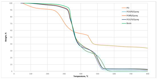 TGA curves of PO, neat epoxy, and PO–epoxy composites (10 °C/min in air).