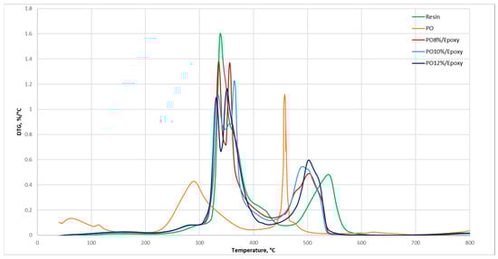 DTG curves for PO, cured epoxy resin, and PO–epoxy composites.