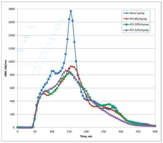 Heat release rate as a function of time for the hybrid PO–epoxy composites (incident flux 50 KW/m2).