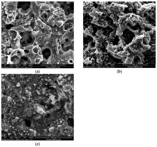 SEM observations were performed on the final residue samples. Figure 10a–c show the scanning electron micrographs of the composite materials incorporating PO at 8%, 10%, and 12% (w/w). A char porous layer characterizes all systems, with a different level of porosity. In particular, the 12% (w/w) PO–epoxy is slightly porous and has a more compact topography.