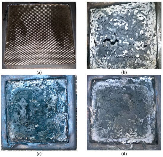 Digital images of PO–epoxy composites after burning: (a) neat epoxy basalt composite, (b) PO 8%–epoxy, (c) PO 10%–epoxy, (d) PO 12%–epoxy.