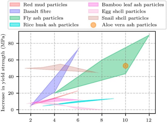 Delving into greater detail, the study by Seetharaman et al. does mention, beyond the introduction of basalt fibers and some industrial waste, such as red mud, or agricultural refuse, such as rice husk ash, eggshells and snail shells, incinerated lignocellulosic material, based on coconut shells, bamboo fibers and sugarcane [18]. Data on the improvement in compressive stiffness with respect to the amount of filler introduced are reported in Figure 2. These data clearly indicate that the effect obtained, provided the distribution of the filler was uniform, may largely exceed the amount introduced. Casting methods proposed for the fabrication of hybrid MMCs include either melt processing, through stir casting, or forcing it in various ways, which include mechanical load, the use of gas or vacuum pressure and ultrasound. In some cases, different methods are also combined, such as in squeeze casting, where mechanical stirring is then supplemented by the application of pressure [19].