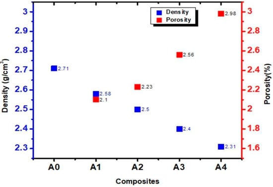 Density and porosity of various MMCs: A0 Al-alloy; A1 Al-alloy + 15 wt.% coconut shell ash (CSA); A2 Al-alloy + 5 wt.% CSA + 5 wt.% rice hull ash (RHA) + 5 wt.% cassava peel ash (CPA); A3 Al-alloy + 15 wt.% CPA; A4 Al-alloy + 15 wt.% RHA [69].