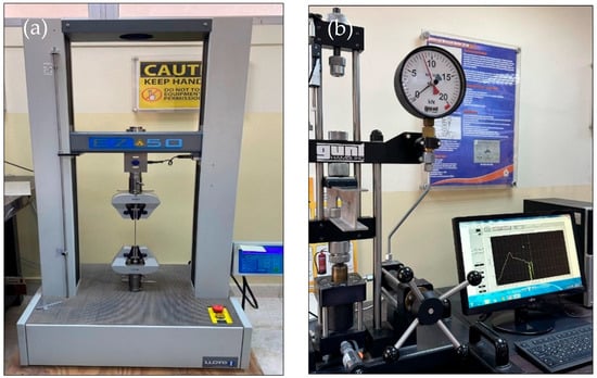 The composite laminate specimens for various tests are shown in Figure 2. The laminates were tested for their tensile behavior using a Universal Testing Machine of a 50 kN capacity (make: Lloyd EZ-50, UK), shown in Figure 3a. The tensile test specimens with the dimensions 250 × 25 × 2.5 mm were prepared according to the standard ASTM D3039 [13]. The tensile test was carried out with a gripping length of 25 mm on both sides and a strain rate of 5 mm/min and the data were recorded using the Data Acquisition (DAC) system(Software: Nexygen 4.1) attached to the machine. The stress-strain behavior of the composite laminates is explained in detail in the next section. The composite laminates were also subjected to test their flexural, shear and impact behaviors and the corresponding specimens were prepared as per the standards ASTM D790, ASTM D2344 and ASTM D256 [14,15,16], respectively. The experimental set up is shown in Figure 3. The flexural test and inter laminar shear test was carried in a 20 kN Universal Testing Machine (Make: Gunt Hamburg—WP 300, Germany), shown in Figure 3b. The span of the flexural test specimen was 100 mm and the transverse load was applied at a uniform speed of 5 N/s. The load and corresponding lateral deflections were recorded using the DAC system attached to the machine. The loading conditions remain same for the inter-laminar shear test and the testing characteristic was a short beam test with a 40 mm span between the supports. The flexural strength and inter-laminar shear strength of the laminates were determined using Equations (5) and (6). The impact strength of the composite laminate was determined by conducting an Izod impact test to study the influence of alumina micro particles enhancing the core toughness and damping capacity of the laminate. The impact strength of the laminate was calculated using Equation (7).