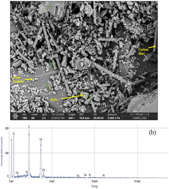 (a) SEM micrograph of CFRP laminate with 4% Al2O3 (b) corresponding EDX spectrum.