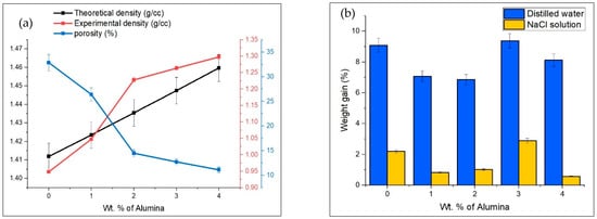 It was observed from the results of water absorption, shown in Figure 5b, that the weight gain percentage due to water absorption was highest at about 27.84% for CFRP laminate with 0% Al2O3. In general, carbon fibers do not absorb water and the resin absorbs the water and increases its plasticity. In CFRP laminate with 0% Al2O3, the water absorption is higher due to the appreciable reactivity of the resin and the absence of the filler material. The water absorption took place by a diffusion process in the interfaces between the carbon fiber and the resin. The water gain % gradually dropped with an increase in the weight % of Al2O3 micro particles. The improved interlocking between the fibers due to the addition of filler material reduced the voids in the interfaces and increased the path for the water diffusion and in turn reduced the plasticity of the resin too. These results complement the results of hardness being increased significantly by adding the alumina fillers. In general, water absorption in the polymer composite laminates occurs due to the relaxation of segments of the polymer chain in the composite laminate and in turn the increase the diffusion rate of water molecules. This relaxation process of the polymer chain segments might be disturbed significantly with 0.9% NaCl solution due to the presence of salt ions. The trend of water gain % as seen in Figure 5b complements the results of hardness of CFRP laminates. A non-linear trend exists after 2% alumina, which may be due to possible agglomeration at a higher weight fraction of alumina. The irregular structure of alumina particles at higher weight fractions resulted in voids across the pool of particles, which in turn increased the path for water absorption. These voids gradually reduced at further, higher weight fractions of alumina particles.