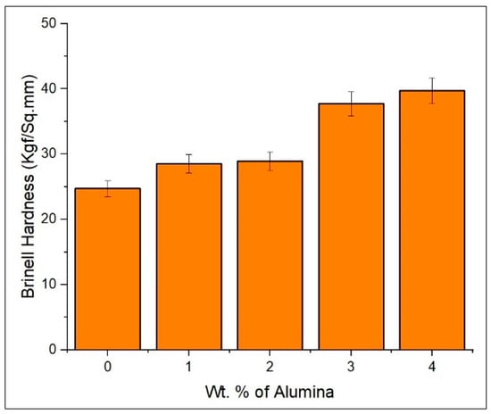 The Brinell hardness of the CFRP specimens is presented in Figure 6. A steady rise in hardness was observed in the CFRP specimens with increase in weight % of Al2O3. The lowest hardness of 24.71 kgf/mm2 was observed for CFRP with 0% Al2O3. This was due to the soft matrix, with resin being the major content in the laminate. As the alumina content is increased in the laminates, the harder alumina particles contribute to the improvement of hardness of CFRP specimens. With a higher content of harder alumina, the interlocking capacity of the laminate is increased significantly and also increased the hardness due to increased surface area of the alumina. The highest hardness of 39.72 kgf/mm2 was observed for CFRP with 4% Al2O3, which was around 60% higher than for 0% laminate. It was observed from the figure that a marginal rise exists between 3% and 4%.