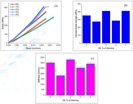 The observations obtained during the tensile test of CFRP laminates is presented in Figure 7a as stress-strain diagrams. It was observed from the figure that the maximum tensile strength was obtained for CFRP laminate with 2% Al2O3 micro particles and the least strength was observed for CFRP laminate with 1% Al2O3. The stress-strain behavior of the CFRP laminates confirmed that the laminates were brittle in nature, which may be due to epoxy in the laminate, which was a thermoset polymer and the presence of alumina micro particles in the laminate. The inclusion of hard ceramic particulates with the epoxy had increased the strength of CFRP laminates significantly and on the other side reduced the plasticity or strain rate too. From Figure 7b, it can be noticed that a maximum tensile strength of 400 MPa was obtained for CFRP laminates with 2% and 4% Al2O3 with corresponding strain of 0.02 mm/mm. Initially, with the addition of Al2O3 micro particles, the flow behavior of the epoxy was restricted around the fibers and to a certain extent affected the tensile strength also. With subsequent increase in the content of Al2O3 micro particles, the tensile strength increases reasonably due to extended grain boundary and enhanced interfacial bonding between the fibers, epoxy and alumina particles [17,18,19,20]. The non-linear behavior of tensile strength was similar to that of the observation made in water gain %. Although there was a positive trend in tensile strength with respect to the weight fraction of alumina, particularly at 1% and 3%, there was a significant drop observed, which may be due to the disturbance in the alignment such as pooling of alumina particles within the matrix. It may be also due to certain uncertainty in the mechanical mixing of alumina fillers in the matrix. The non-uniform speed of mixing may also be one of the reasons for the non-linear behavior in the tensile strength with respect to the weight fraction of alumina. This was not due to experimental error because the observation plotted was the average of three trials with similar configured specimens and at the same conditions. The water absorption in the composite laminate led to the degradation of the material’s structure and interfacial strength between the matrix and fiber of the composite, which in turn weakens the bonding strength. However, there was a contradiction initially for 0 to 1% of Al2O3, after which the water absorption behavior correlated with the tensile strength behavior of the laminate.