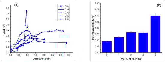 The results of flexural behavior of CFRP laminates is shown in Figure 8a,b. Laminates with 0% Al2O3 micro particles were found to be weaker against flexural loads compared to that of other laminates. The carbon fibers in the laminate are inferior against transverse loads compared to that of tensile loads, which in turn led to weaker flexural strength. Increase in the weight fraction of Al2O3 micro particles in the epoxy resulted in an increase of flexural load capacity to a greater extent. Maximum flexural strength of about 1.5 MPa was observed for the CFRP laminate with 4% Al2O3. Adding ceramic particulates in the epoxy arrests the deformation against transverse load and withstands maximum load with least bending due to the improved interlocking capacity of the laminate. In contradiction to tensile behavior of the CFRP laminate, with respect to flexural loading, the flexural strength was significantly improved steadily with the increase of alumina micro particles. This may be due to the direction of loading, i.e., transverse direction, being resisted more by the carbon fibers and alumina micro particles [22,23,24].
