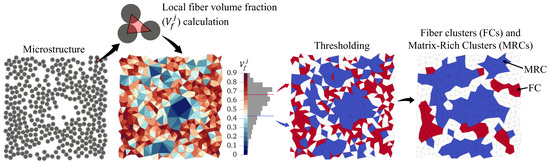 The microstructure characterization process, where fiber positions are triangulated to calculate a local fiber volume fraction, . Then, triangles are filtered as fiber clusters (FCs) or matrix-rich clusters (MRCs) based on thresholding. Smoothing is employed to obtain the final FC and MRC descriptors.