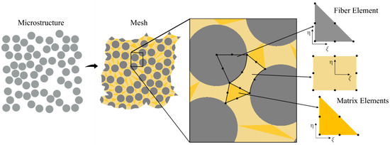 Mesh discretization of a microstructure where higher-order fiber and matrix elements are represented in an isoparametric space.