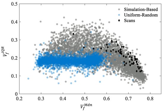 Local fiber volume fraction inter-quartile range, , for 3500 artificial microstructures created with a simulation-based generator and with a uniform–random generator. Fifty characterized microstructures obtained from microscopy scans are also shown for comparison.