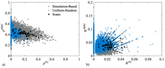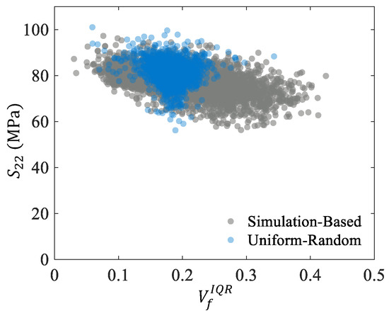 The simulation-based generator shows an observable trend between and . As increases, tends to decrease. But with the uniform–random generator, only a slice of the data is captured, which is consistent with the previous observations in Figure 3. When comparing the scan data plotted in Figure 3, many scan samples have a greater than 0.25, and the uniform generation cannot capture that. Thus, uniform–random microstructures will tend to over-predict .