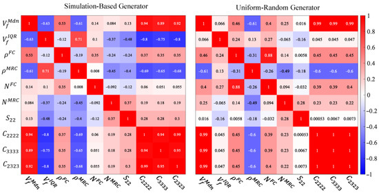 Correlation matrices between descriptors and mechanical properties for microstructures generated with the simulation-based method and with the uniform–random method.