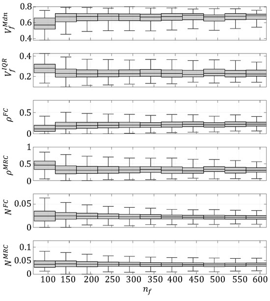 Microscopy scans were sampled with randomly placed square windows to measure fiber arrangements that may occur in real parts. Windows ranged in size from to in increments. A total of 5500 windows were obtained for each size, which were measured across 11 scans. Values of the six descriptors, , , , , , and , were measured as a function of the number of fibers, , and are plotted in Figure 7.