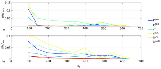 Root mean squared (RMS) of (a) the median and (b) IQR of measured descriptors as a function of the number of fibers, value.