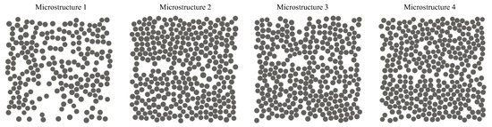 A simple, uniform–random microstructure generator was also implemented in this study. These types of generators are often referred to as random sequential absorption (RSA) algorithms and have already been rigorously studied and critiqued. RSA generators are often simplest to implement due to the few independent variables, , , and , and still are widely used as the default choice to create artificial arrangements [44,67,68,69]. Given the wide breadth of generators developed for the same purpose, it is significant to distinguish their capabilities and how they relate to mechanical properties. If a simpler algorithm, such as RSA, can capture real-life morphologies, then it likely should be the default choice for that microstructure generation.