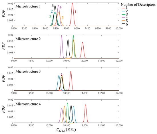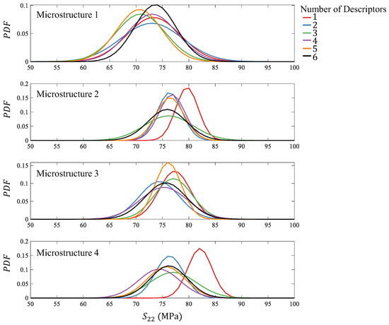 The distributions in Figure 11 for microstructures one and three show no meaningful differences between all cases. Microstructures two and four share similar results to Figure 10, where the case with one descriptor tended to over-predict. The reason for this is the same as stated previously, only using one descriptor does not ensure any uniqueness to the microstructure, like how two microstructures can have identical but vastly different arrangements. Although not depicted, when comparing this effect on and , a similar trend is shared with and . When one descriptor is used for equivalent generation, the prediction of mechanical properties is higher than in the rest of the cases. Once two descriptors were introduced with and , the results become nearly unchanged with an increasing number of descriptors. This highlights that and seem to be the most important for characterization, but if other, additional descriptors are desired, they can be introduced without significant effect to and .