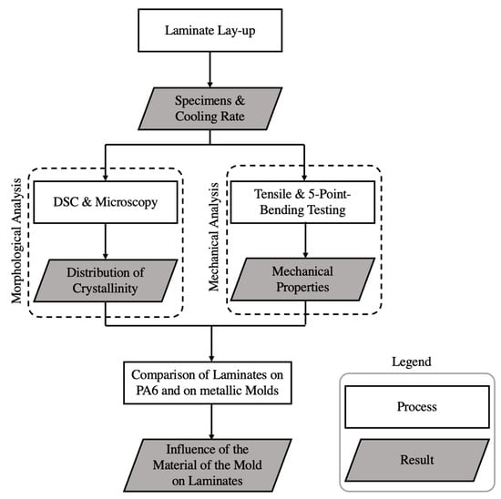 The basic structure of this study is shown in Figure 1. At first, two quasi-isotropic CF/LM-PAEK laminates were manufactured using in situ AFP. One laminate was laid on a PA6 substrate while the other was manufactured using an aluminum substrate. The comparison of these two laminates, regarding mechanical and morphological characteristics, is the goal of this study. During the lay-up, the cooling rates of the first layer of the laminates were measured. After completion of the lay-up, specimens were separated from both laminates. Differential scanning calorimetry and scanning electron microscopy imaging were used to determine morphological characteristics, such as the distribution of crystallinity across the laminates’ cross-section and the difference in bulk crystallinity in both laminates. Tensile tests and five-point bending tests were conducted to determine any difference in mechanical properties.