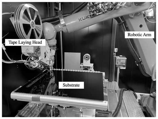 The automated fiber placement facility of the DLR in Stuttgart, Germany, was used for the manufacturing of the laminates and is shown in Figure 2. The system consists of a 6-degree-of-freedom robotic arm, KUKA AG (Augsburg, Germany) Quantec KR210. The end effector of the robotic system is a tape-laying head produced by AFPT GmbH (Dörth, Germany). The head is able to place up to three 12.7 mm wide tapes at once. For this study, only one tape was placed at a time. Tapes were heated using a 1000 nm diode laser.