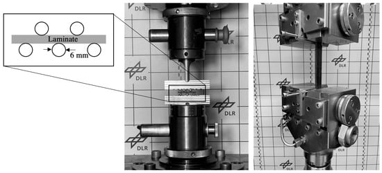 For the determination of the tensile strength of the laminates, specimens were manufactured according to the Airbus test method AITM1-0007 []. Six rectangular specimens with a size of 22 mm × 250 mm were extracted from each laminate. End tabs out of a ±45° glass-fiber-reinforced epoxy material were adhesively bonded to the specimens to equalize the stress distribution during testing. Specimens were tested using a universal testing machine RetroLine 1484 with a 200 kN load cell, manufactured by the company ZwickRoell GmbH & Co. KG (Ulm, Germany), at a speed of 2 mm·min−1. The load was measured as a function of the crosshead displacement.