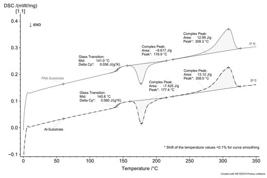 The DSC measurement curves of the first heating for AFP-produced samples on PA6 and aluminum substrate are exemplarily plotted in Figure 4 over temperature. The cold crystallization is visible as an exothermal peak around 178 °C and the matrix melting is recognizable in the endothermal peak above 225 °C. A mean crystallinity value of 11.14% was measured for the laminate manufactured on an aluminum substrate with a standard deviation of 0.79%. Laminates manufactured on a substrate out of polyamide 6 achieved an average crystallinity value of 13.19% with a standard deviation of 0.93%. The difference between the two groups is significant with a p-value of 0.013. The corresponding scatter plot is shown in Figure 5.