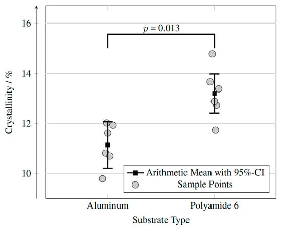 Scatter plot of the crystallinity of laminates manufactured on aluminum and on polyamide 6 (n = 6).