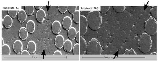 Scanning electron microscope imaging of the area between two exemplary tapes. Laminates manufactured on a substrate out of aluminum (AL) (left) and out of polyamide 6 (PA6) (right). (Arrows indicate location of bonding surface.)