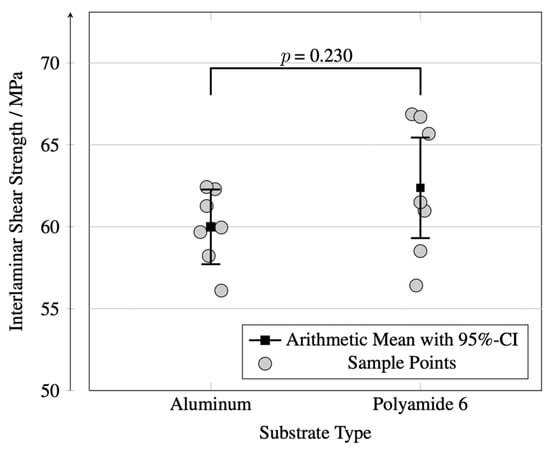 The five-point bending tests indicate no statistically significant difference in interlaminar shear strength between laminates manufactured on aluminum and those manufactured on polyamide 6 (p = 0.230). Laminates manufactured on an aluminum surface achieved a mean ILSS of 59.99 MPa with a standard deviation of 2.28 MPa. When polyamide 6 was used as a substrate, a mean ILSS of 62.37 MPa with a standard deviation of 4.14 MPa was achieved. The corresponding scatterplots can be seen in Figure 7.