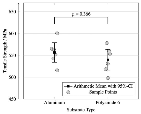 Scatter plot of the tensile strength of laminates manufactured on aluminum and on polyamide 6 (n = 6).