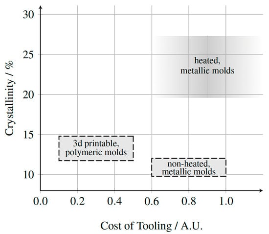 Achievable crystallinity of composites with a polyaryletherketone matrix and the cost of molds dependent on tooling technology. Based on the results of this study and literature [,,,]. (Areas with dashed borders used crystallinity values determined in this study; A.U.: arbitrary unit).