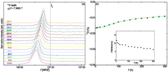 Figure 1a shows the temperature dependence of the 31P NMR spectra of Pb10−xCux(PO4)6O measured under μ0H = 7.3685 T. The Larmor frequency f0 is also shown in the figure. The observed spectra are relatively sharp, whose full width at half maximum (FWHM) is 6.41 kHz (= 3.72 Oe) at 300 K and increases slightly with decreasing temperature, as shown in the inset in Figure 1b. The peak position of the 31P NMR spectra shifts very little as temperature decreases. The temperature dependence of NMR shift for 31P, 31K, determined by the peak position, is shown in Figure 1b, where 31K decreases slightly as the temperature lowers from −0.009(1)% at room temperature to −0.016(1)% at 4.2 K. Since the NMR shift is related to static magnetic susceptibility (χ), the small negative 31K could be due to the diamagnetism observed in the magnetic susceptibility of this material [6]. It is noted that, although the magnetic susceptibility shows an increase at low temperatures, we did not observe such a change in 31K corresponding to the increase in χ at low temperatures [6,11]. Thus, we conclude that the increase in magnetic susceptibility at low temperatures is not intrinsic but extrinsic, coming from impurity phases.