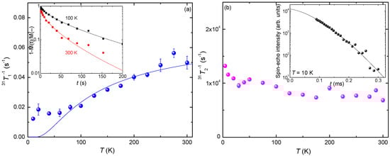 As shown above, our NMR spectra and 1/T1 measurements of 31P indicate that the system has a non-magnetic insulating ground state without any phase transitions below 300 K. We did not find any trace of phase transitions either in the temperature dependence of the 31P spin–spin relaxation rate 1/31T2 shown in Figure 2b, where 1/31T2 increases slightly and smoothly with a decreasing temperature, evidencing no phase transition below 300 K.