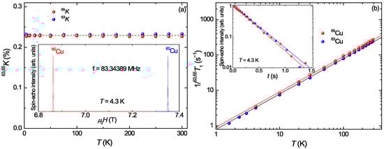 Several theoretical studies indicate that the dominant contribution to the flat bands in Pb10−xCux(PO4)6O is from Cu d-electrons [12,13,14,15,16,17,18,19,20]. Therefore, since magnetic fluctuations, if they exist, are expected to originate from the Cu d electrons, NMR measurements on Cu sites are very important. Thus, we carried out 63/65Cu NMR measurements on the Pb10−xCux(PO4)6O powder sample. We observed very sharp 63/65Cu NMR lines, as shown in the inset of Figure 3a. We examined the observed 63/65NMR lines from the temperature dependencies of NMR shifts (Figure 3a) and 1/T1 (Figure 3b) measurements. The observed NMR shift of K~0.23% and 1/T1 data (1/T1T = 0.79 (1/sK) for 63Cu and 1/T1T = 0.91 (1/sK) for 65Cu) are the same as those in Cu metals [31]. Therefore, we conclude that the observed Cu signals are from Cu metals, not from Cu ions in Pb10-xCux(PO4)6O if any Cu atoms exist. We also tried to search for any other 63/65Cu NMR signal; however, no other NMR signal was detected. Thus, our NMR results suggest that no copper or only very little copper substitutes for Pb in our Pb10−xCux(PO4)6O powder sample, which was synthesized by sintering Pb2SO5 and Cu3P.