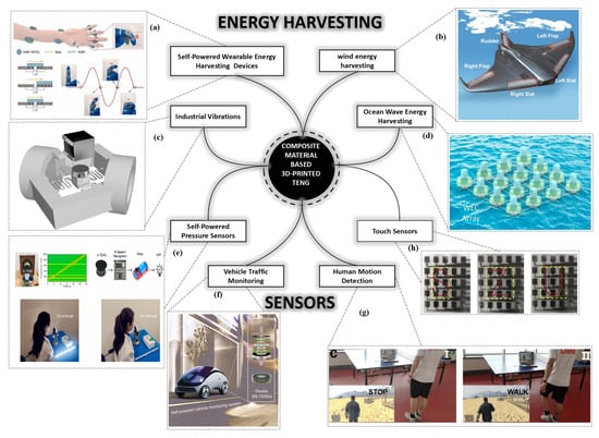 Prospective utilizations of energy harvesting and sensors employing 3D-printed triboelectric nanogenerators (TENGs). (a) Self-powered wearable harvesting device [], (b) wind energy harvesting [], (c) industrial vibration [], (d) ocean wave energy harvesting [], (e) self-powered sensor [], (f) vehicle traffic monitoring [], (g) human motion detection [], and (h) touch sensor [].