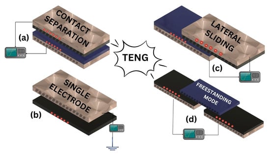 Since the inaugural report on TENGs in 2012, and based on their electrode configurations and orientations or polarization alternations, they have been divided into four distinct modes, as illustrated in Figure 2: vertical contact–separation (CS) mode, lateral-sliding (LS) mode, single-electrode (SE) mode, and freestanding triboelectric layer (FT) mode. A critical element of the TENG design is the effective induction of triboelectrification. Establishing an appropriate operational mode ensures the efficacious use of ambient external mechanical energy and provides triboelectrification suitable for a specific TENG configuration. The three typical operational modes are the sliding mode, the contact–separation mode, and the freestanding mode. Every mode is accessible for electrode arrangements: single and double electrodes. The double-electrode design primarily facilitates the above three operating modes [].