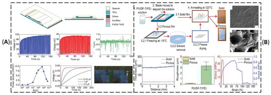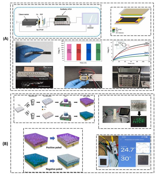 (A) Visual depiction of B4C/PVDF TENG setup [], and (B) N-Ti3C2 and PVDF-TrFE negative- and positive-poled TENGs [].